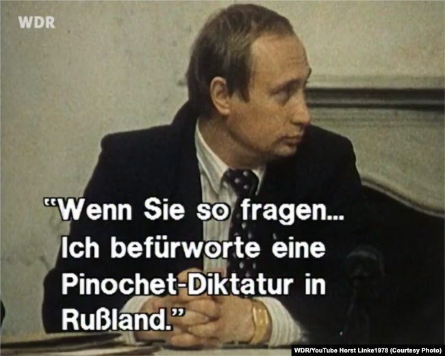 "Владимир Путин, вице-мэр Санкт-Петербурга и председатель Комитета по внешним связям шестимиллионного города, дал понять немецким представителям деловых кругов, что военная диктатура по чилийскому образцу была бы желаемым для России решением нынешних политических проблем", – говорилось в публикации. Газета уточнила, что Путин "разделил политическое насилие на "необходимое" и "криминальное", причем "необходимым" назвал лишь то, которое защищает экономические реформы и частные инвестиции" (в сюжете WDR этого фрагмента нет).